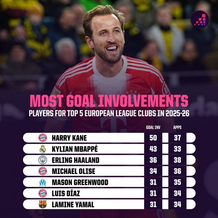 3月3日讯 Opta统计了五大联赛球员本赛季的参与进球数量,并列出榜单,凯恩参与50球居首,姆巴佩参与43球次席。